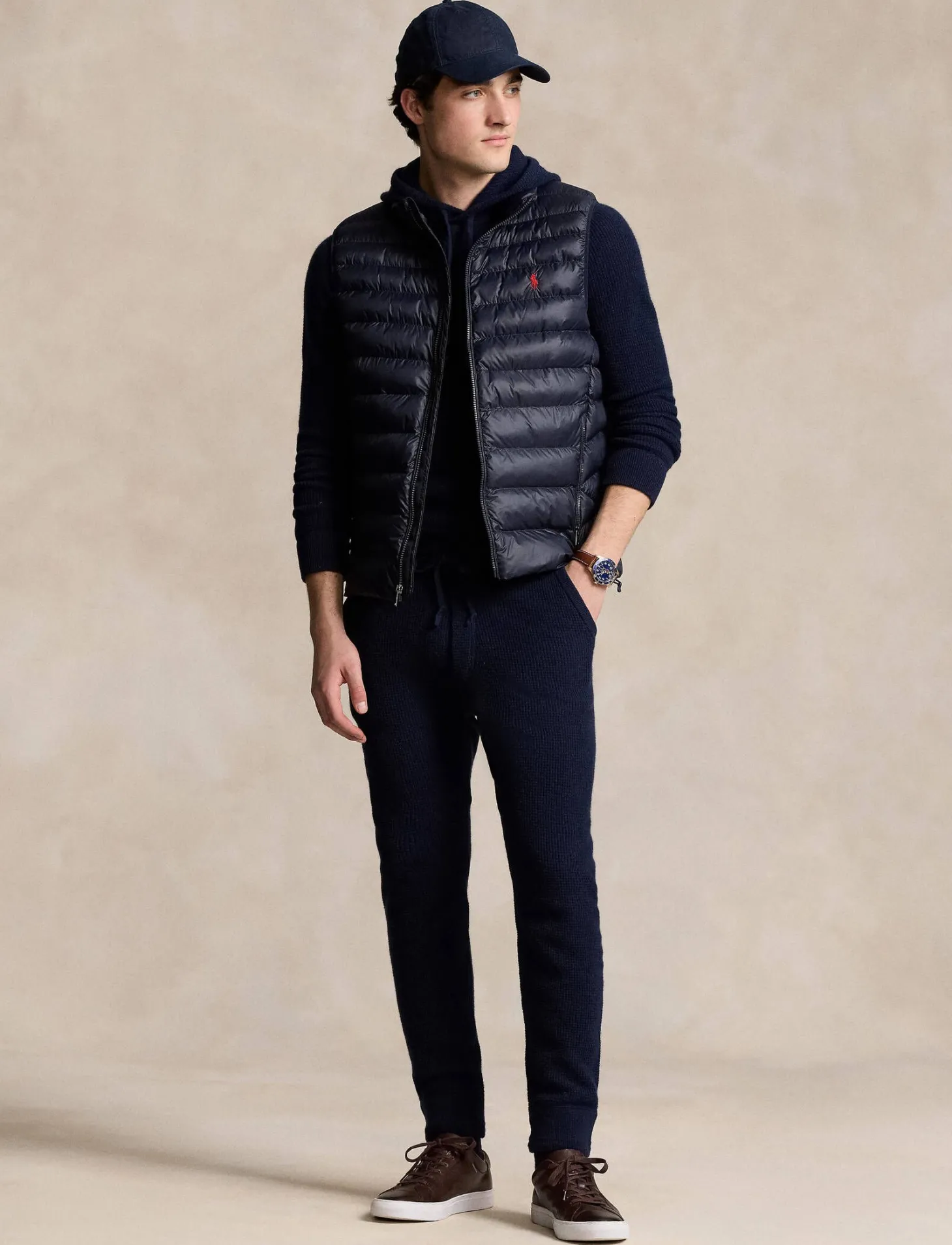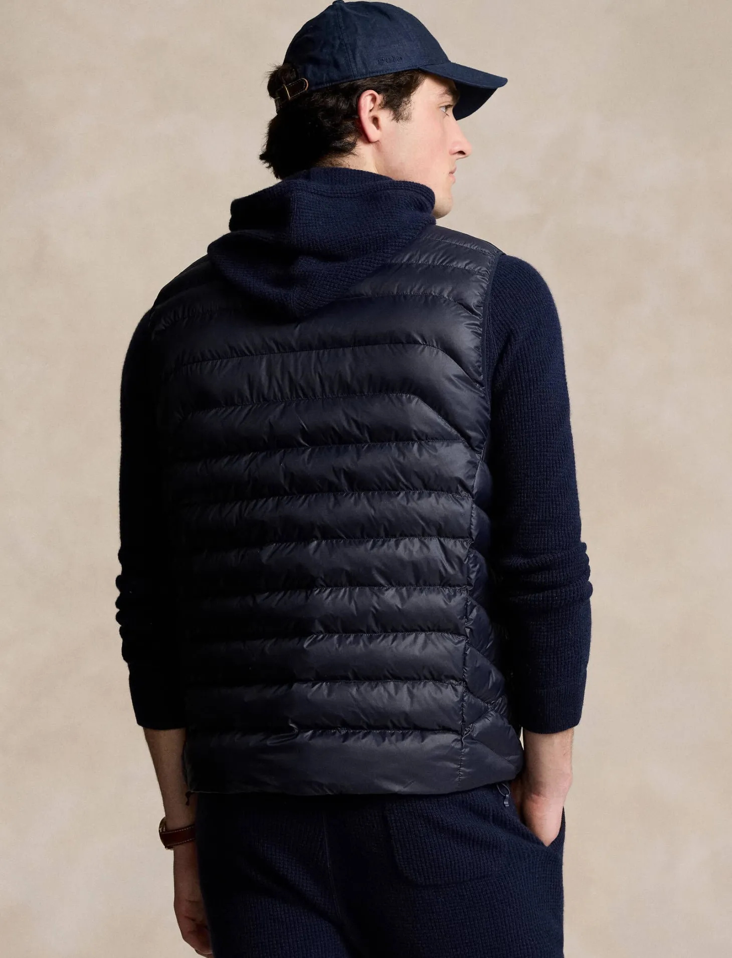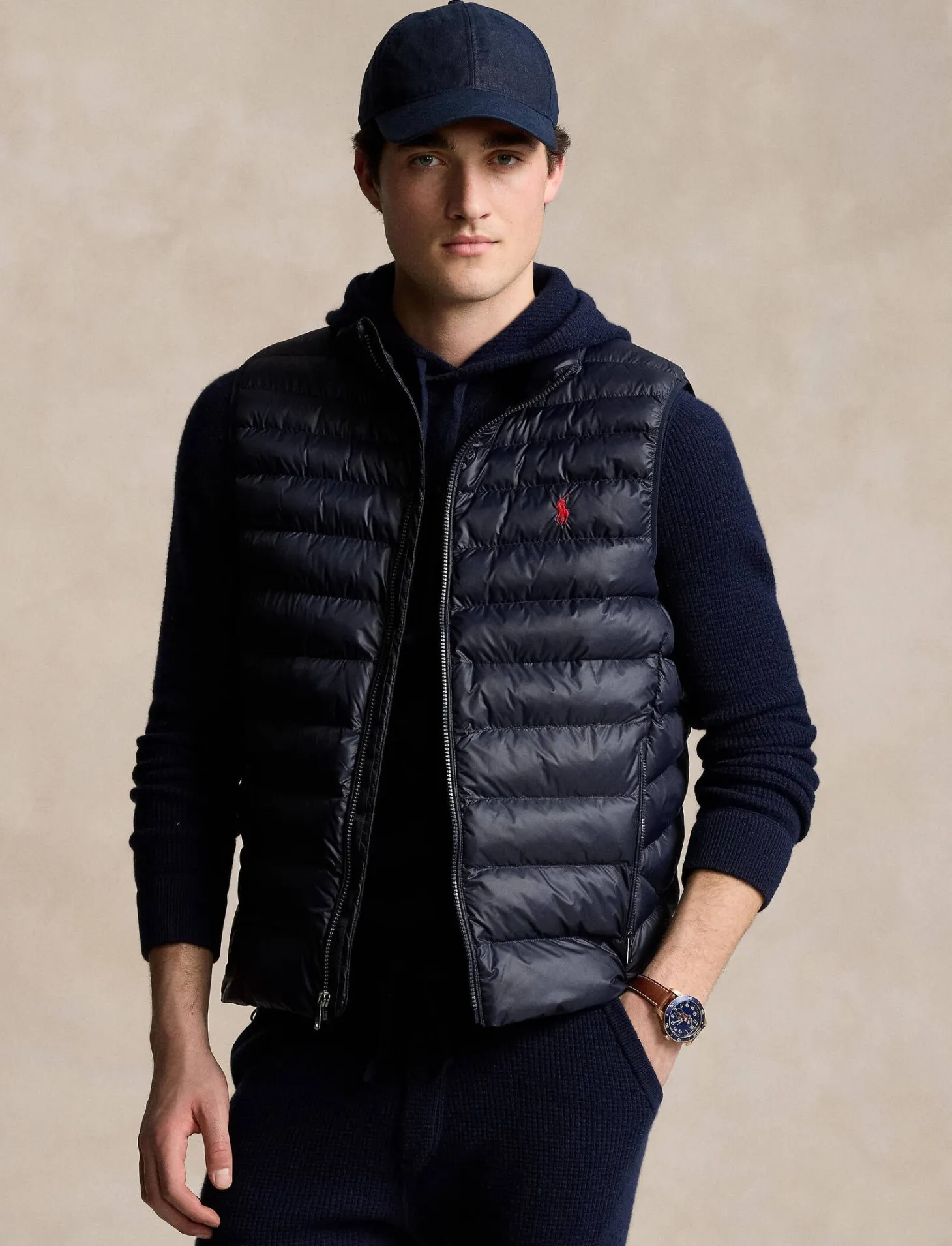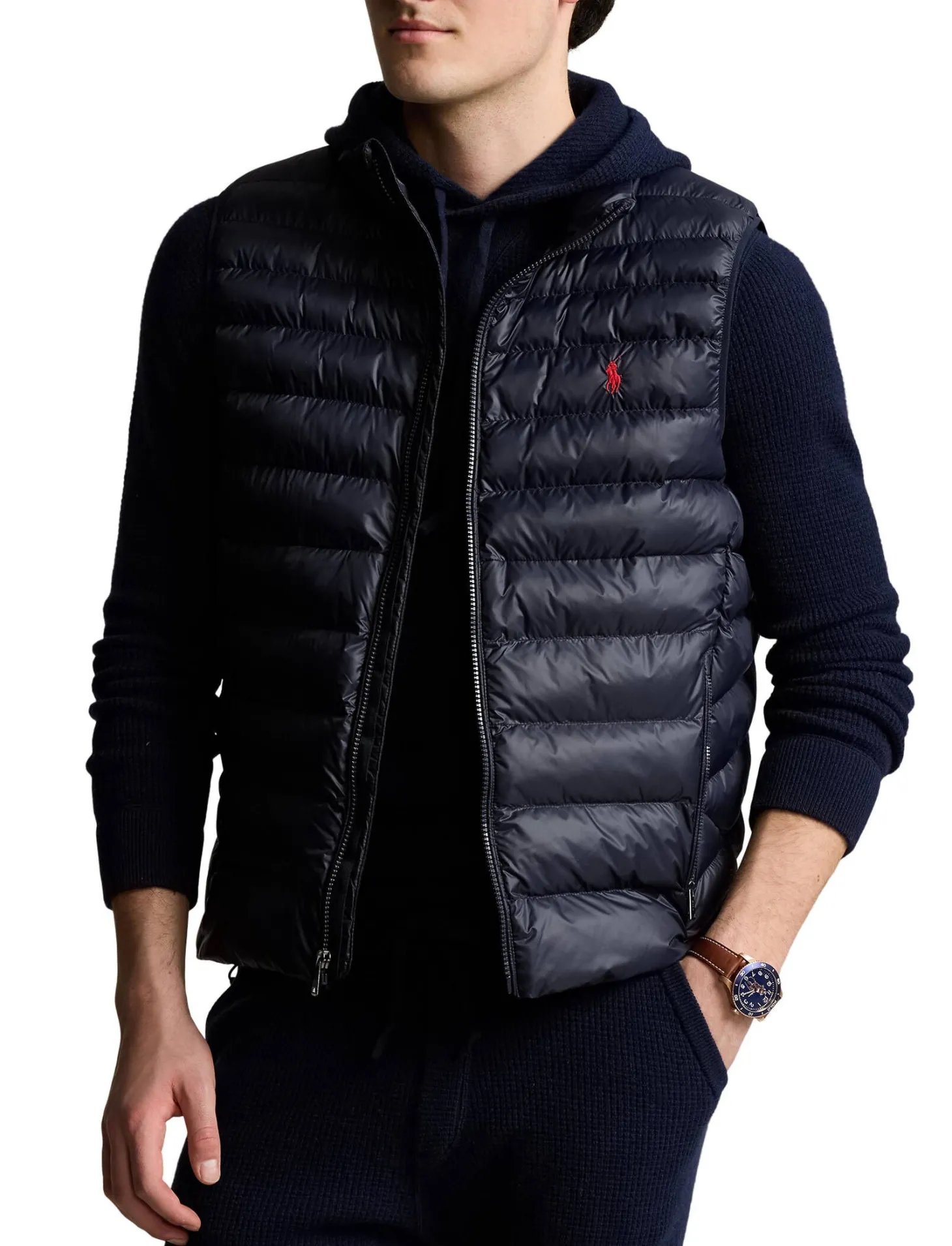Die klassische Steppweste von Polo Ralph Lauren ist in der Übergangszeit vielseitig einsetzbar und in der eigenen Seitentasche verstaubar.