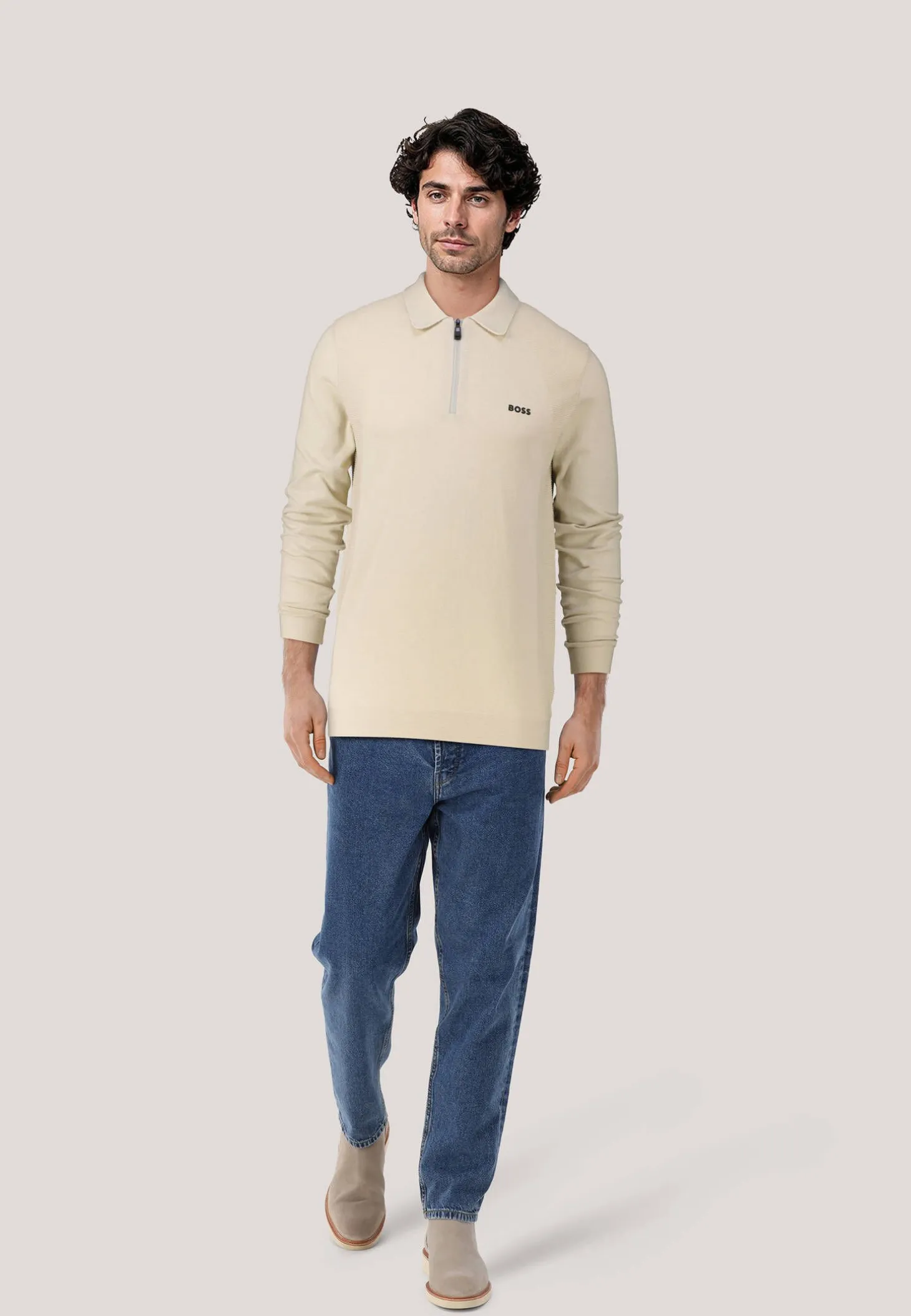 Der leichte Pullover von BOSS punktet mit filigraner Strickstruktur an den Seiten und Reißverschluss.