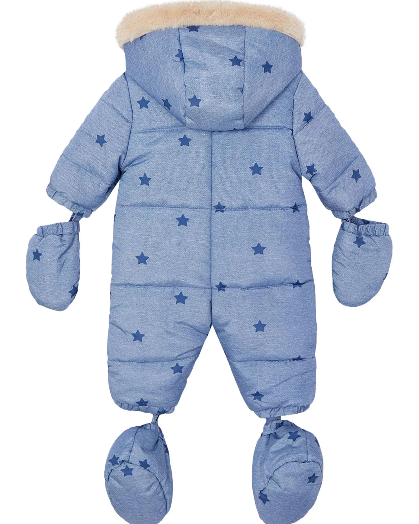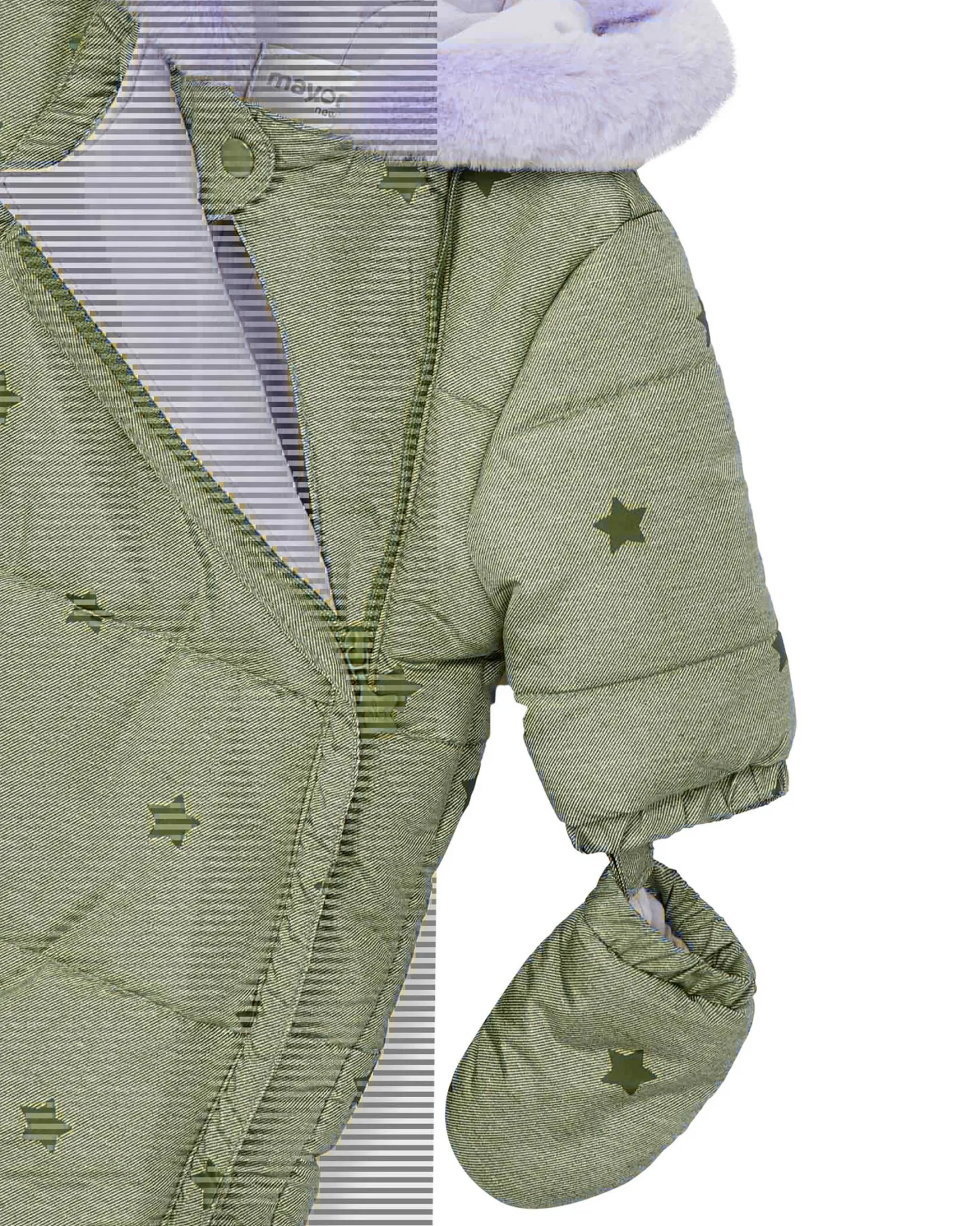 Der kuschelig warme Schneeoverall von Mayoral ist mit seinem hinreißenden Muster zum Knuddeln lieb. Ein Latz mit zweiseitigem Reißverschluss dient als praktische Öffnung. Flauschig gefütterte Fäustlinge und Schühchen, die am Saum befestigt sind, können nach Bedarf flexibel an- und ausgezogen werden.