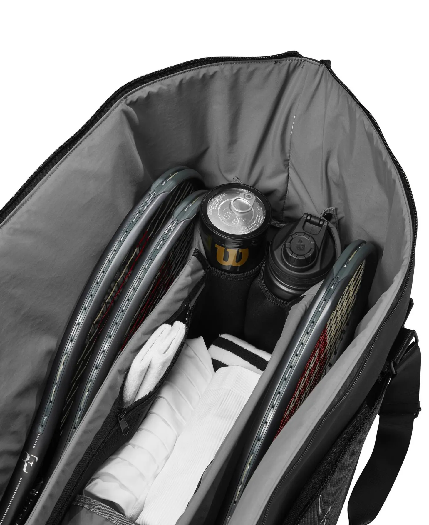 Die Tennistasche aus der Roger Federers Kollektion von Wilson beeindruckt mit einer hochwertigen Verarbeitung sowie einer praktischen und funktionalen Konstruktion mit geräumigem Stauraum für bis zu 6 Schläger.